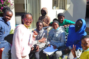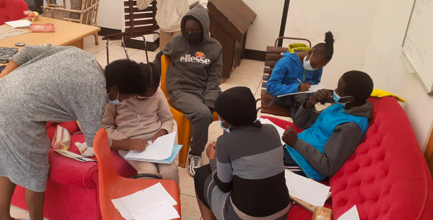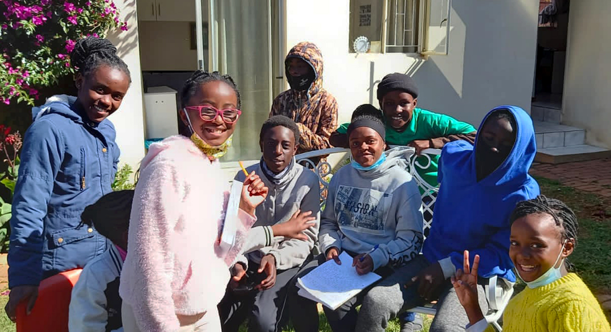 Once we emerged to a lower Lockdown, we were able to restart our Saturday lessons in Afrikaans for our students, kindly given by our very dedicated teacher, Innocentia. Because of Covid caution and restriction, we have limited our number to only 15 and divided them into two groups at our play centre, outside. The photo shows their joyful enthusiasm.