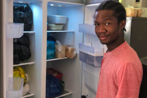 The photo shows our Masengo, who is the food and fridge keeper, packing food donated weekly by St Vincent de Paul Society into our beautiful new fridge.