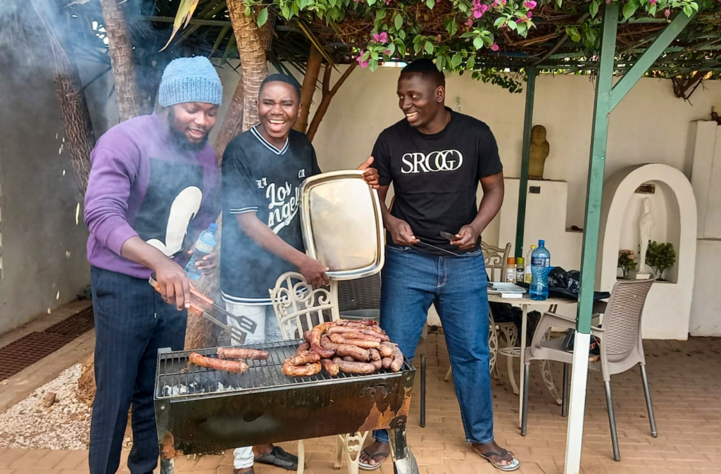 Those of us on the organising side, now have a saying: “Don’t forget the boerewors!” The reason for this is: Diana was really worried about the cost of getting so much meat for a large group. By sheer “co-incidence”, Mr Godfrey Fortuin of SVdeP Honeydew, happened to phone to ask if we had any needs! Diana mentioned the upcoming braai and also extended an invitation. Godfrey could not come, but instead, on that very day, 20 kilograms of boerewors was delivered to Mercy House from his organisation. We were totally amazed – it felt like a modern experience of the miracle of the loaves and fishes! And it goes without saying that we had plenty of meat!!! Thank you, Mr Godfrey, you care so well for us and we appreciate that.