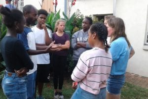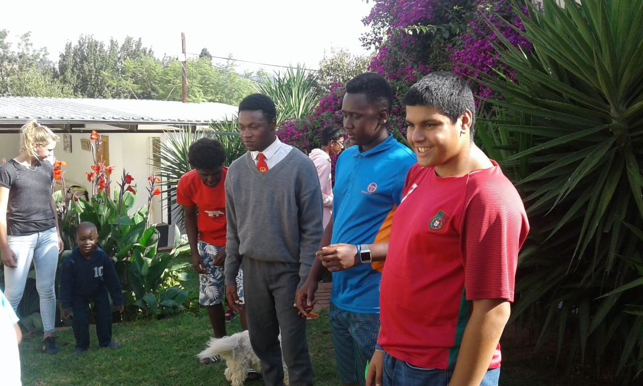 On Tuesday, 26th April, six of our Mercy House scholars visited the American International School (AISJ) in Pretoria, which, as usual, they enjoyed very much. But the real highlight and fun was on the following day, when a large number of the AISJ pupils, with several of their teachers, visited us in Bez Valley. Many of our scholars attended this event. It is a wonderful exchange for both parties, each having so much to share and enrich the other. Most of the scholars at AISJ are diplomats’ children, so live very different lives from our refugee children, who have truly heart-rending stories to tell, if they are able! Our visitors came laden with loads of bags of second-hand clothing and tasty goodies for refreshments. Great fun was had playing games of different sorts. The photos reflect the spirit of the day.