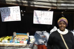 In late July we were able to give Esperance new hope (which of course is the meaning of her name!).  We had been able to obtain a donation for her to start a small business, which she plans to call: Safari Foods. She has high hopes, but for now, started modestly, as seen in the photo, renting half a tin shanty structure.  She sells dry food there and any second-hand clothing we can get. We were also able to get her a deep freeze and she takes orders from there for fresh meat, which she supplies.